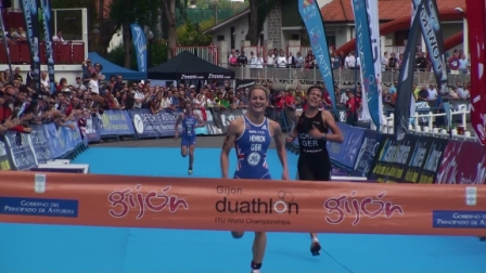 La británica Hewison se ha impuesto en el Cto del Mundo de Duatlon de Gijón: La prueba quedó seleccionada en el primer 10000 donde el fuerte ritmo impuesto por la francesa Lavanez fue seleccionando a las duatletas al paso de cada vuelta, finalmente por el Km 8, seis eran las triatletas que aguantaban en el grupo cabecero, entre ellas las españolas Ainhoa Murua y Ana Burgos. Sin embargo en los 2 km finales Ainhoa y Ana ceden unos escasos 15 sg, siendo Lavenez, Schulz, Hewison y la holandesa Bouma las primeras en tomar la bicicleta.