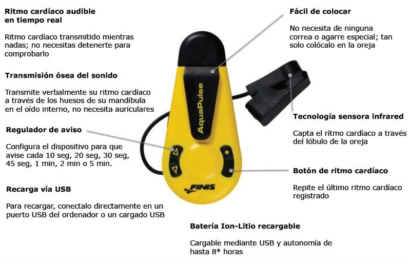 De la mano de Vitalnitritech, nos llega el AquaPulse, un pulsómetro que gracias a su diseño resistente al agua, su sensor infrarrojo y la tecnología de transmisión ósea de Finis, un nadador puede saber su ritmo cardiaco de una forma mucho más precisa, nadando continuamente sin detenerse. AquaPulse transmite el ritmo cardiaco periódicamente y permite programar este período desde los 20 segundos hasta los 5 minutos. Todo integrado en un pequeño dispositivo que se sujeta en la correa de las gafas.