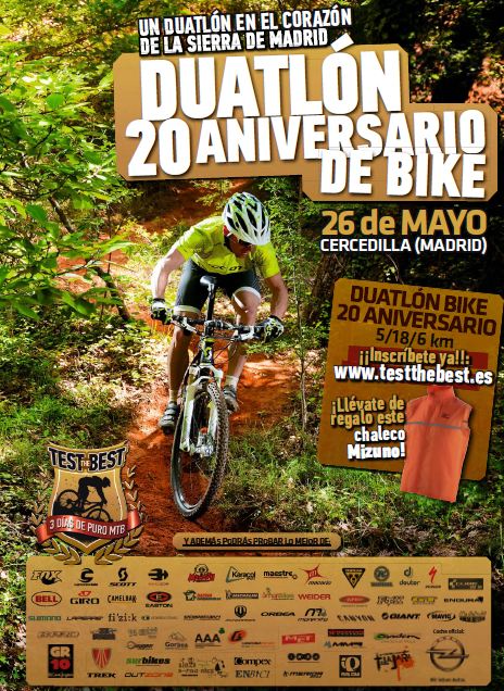 La Revista Bike, perteneciente al prestigioso grupo Motor Press Iberica, celebrará el 26 de mayo el Duatlon Cros XX Aniversario Revista Bike. La prueba contará con 5 km-18 km-6 km, y estará encuadrado dentro de las múltiples actividades que la revista tiene preparadas para los 3 días de ese fin de semana.