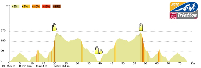 Un recorrido ciclista sin complicaciones 40 km de ida y40 km de vuelta, presenta la subida a Las Hortichuelas por una cara a la ida y por la otra a la vuelta, y dos repechos fuertes y cortos a la ida y los mismos de vuelta.