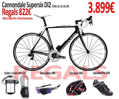 Para ello y hasta fin de existencias en SBR lanzan esta oferta: Compra una Cannondale Supersix DI2, y llevaté gratis; un maillot y culotte de SBR fabricado por Taymory, unas gafas Oakley Radar, un casco Giro Ionos tope de gama , y unas zapatillas también de gama alta Specialized Pro Carbon. Todo valorado en 822€.