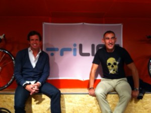 A la presentación acudieron más de 300 personas, entre ellas los triatletas Ramón Ejeda, Alejandro Santamaría, y Marco Rivera. Tambíen el equipo de Triatlon Channel y otros medios fueron invitados, en la foto Pelayo posa junto al gerente del proyecto, el IM finisher Ako Pavía.