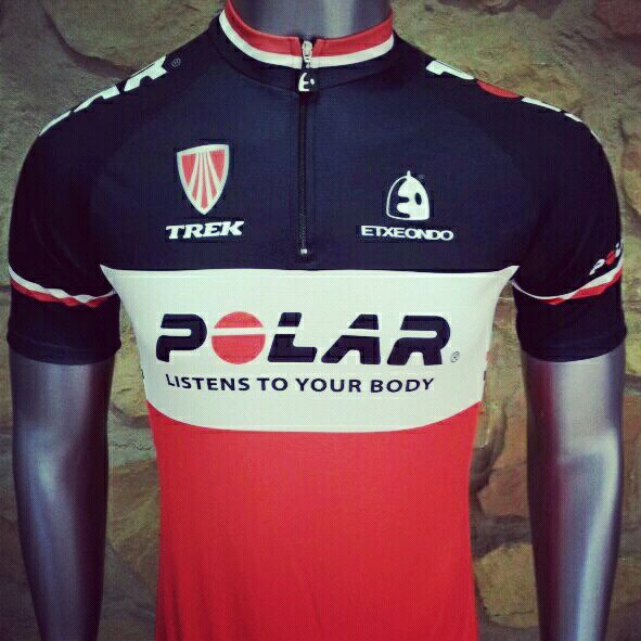 El diseño del maillot refleja los tres colores corporativos de POLAR (rojo, blanco y negro) e incluye los logotipos Etxeondo y Trek. La combinación perfecta de estos