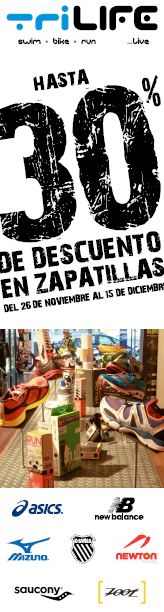 triLIFE saca una oferta en zapatillas del 30%. Los descuentos se extienden a todas las marcas trabajadas por la tienda, Newton, Zoot, Asics, Mizuno, New Balance y K-Swiss. La oferta va del 26 de noviembre al 15 de enero.