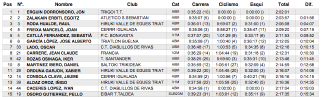 La subida al Alto de Campoo, dejó en cabeza a Erguin, Caceres y Zalacain que llegaban a la T2 con la prueba en el bolsillo. Fueron los equies de fondo los que sentenciaron la prueba en favor de Erguin con una cómoda ventaja de casi 2 m sobre Zalacaín, también dominador de la disciplina. A más de 4 m entró remontando Roda. Freixa y Catlla cerraron el top5 a más de 7 m.