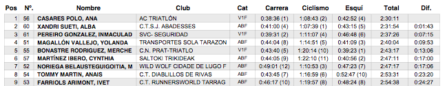 En categoría femenina, 12 participantes en Elite se dieron cita. La veterana Ana Casares dominó el primer 10000 con un minuto sobre otra veterana Inma Pereiro y algo más sobre Lucía Pérez. En el segmento ciclista Ana en solitario aumentó su ventaja, si bien la catalana Sandrí con el mejor tiempo sobre las 2 ruedas la recortó la diferencia, bajándo segunda en la T2 a poco más de 2 m.