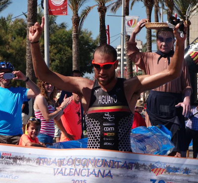 Emilio Aguayo no perdona el día que estrenaba nuevo sponsor, Taymory. La prueba fue resuelta por Aguayo en el segmento ciclista donde se escapó en solitario tras coger al primero del agua Kiko Hervás y llegar a la T2 con 43 sg sobre Hervás quien también llegaba solo a ese punto.