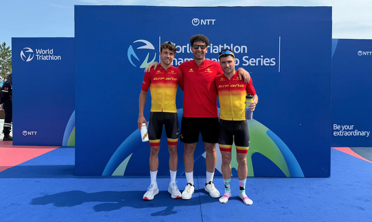 Tras los 10 primeros kilómetros del ciclismo el grupo delantero quedaba reducido a 18 unidades mientras que por detrás venían hombres descolgados y más atrás el grupo de los dos españoles pasaba a 1:25 minutos.