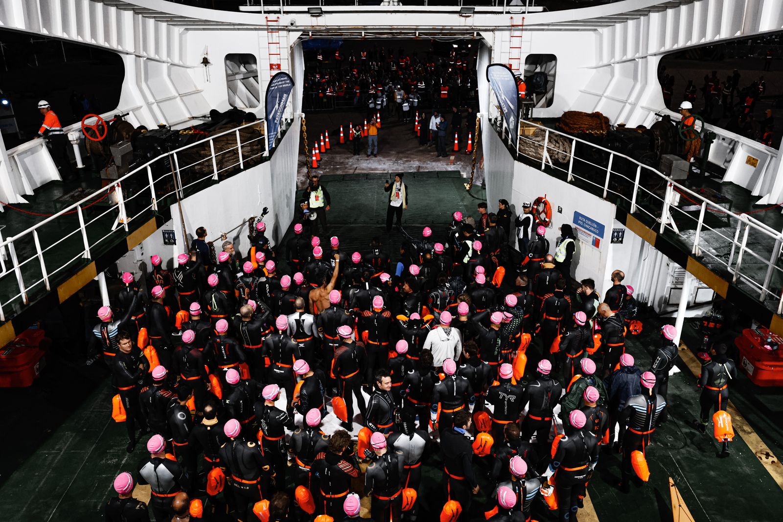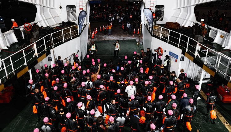 Un día soleado en la localidad de Aysen, la Patagonia, para una prueba durísima y extrema que comenzaba con 3800 m de natación en los que los triatletas eran llevados mar adentro en un barco y saltando desde el mismo a la orilla.